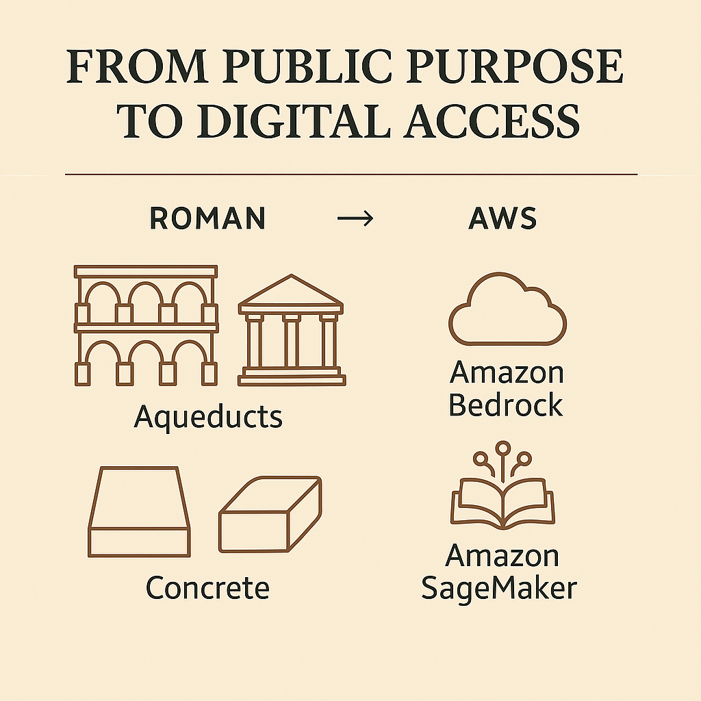 AWS generative AI reflects this civic philosophy by democratizing access to cutting-edge models through cloud-native services. Instead of aqueducts and forums, we have APIs and managed services that distribute intelligence and capability:
